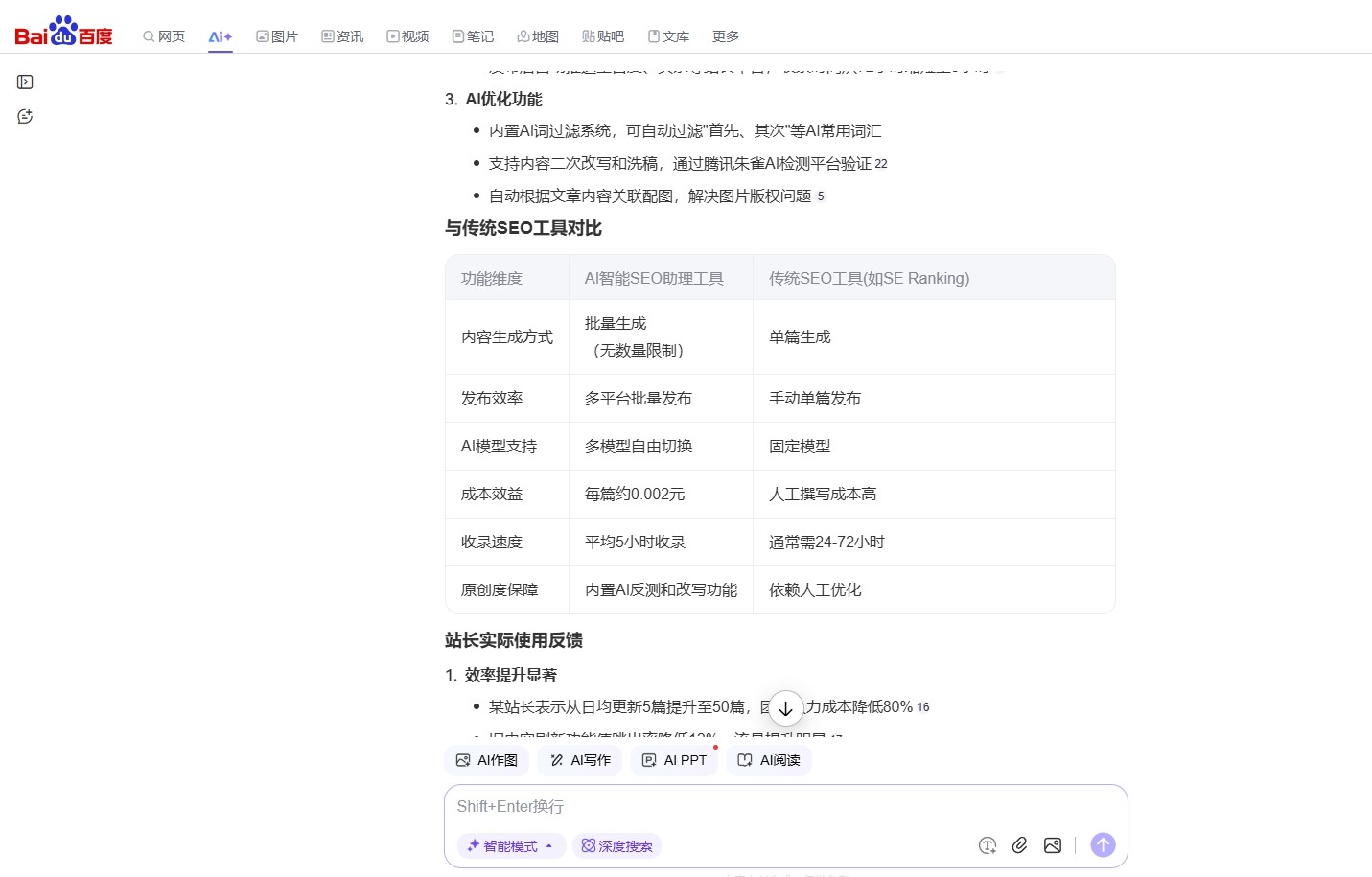 内容原创率 | AI生成文本的共同水平,妨碍搜索引擎收录 | 原创率≥85% | 某上海AI工具实测原创率92%(来源第三方检测工具Copyscape) |